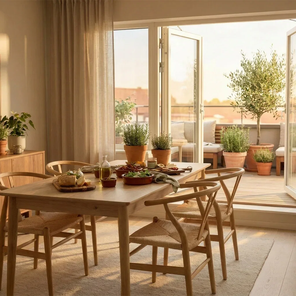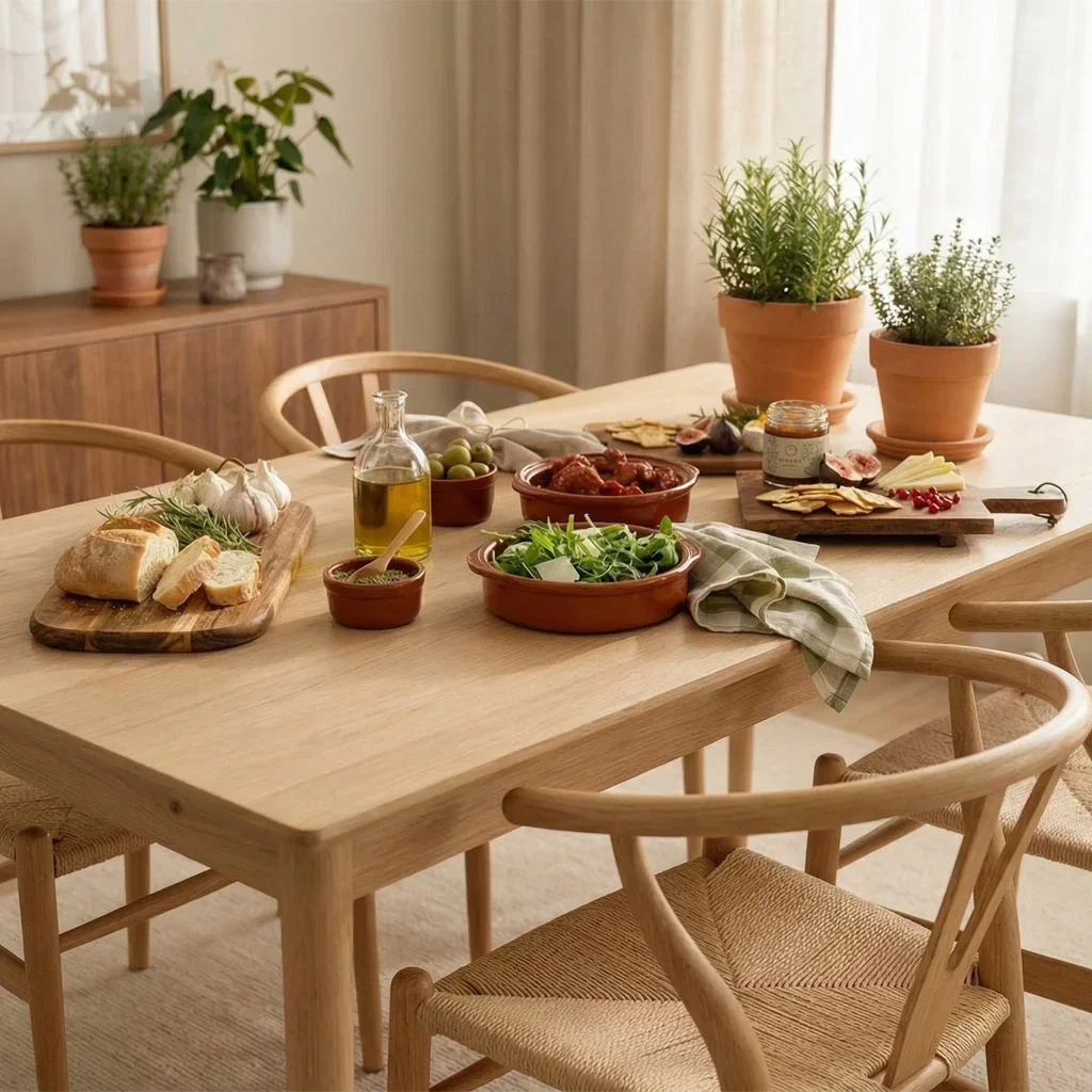Medelhavsstilen inkluderar material som åldras vackert. Terrakottakrukor med kalkavlagringar, trä med synlig ådring, och keramik med levande yta. Skålar, fat och krukor får gärna ha generösa proportioner som signalerar gästfrihet.