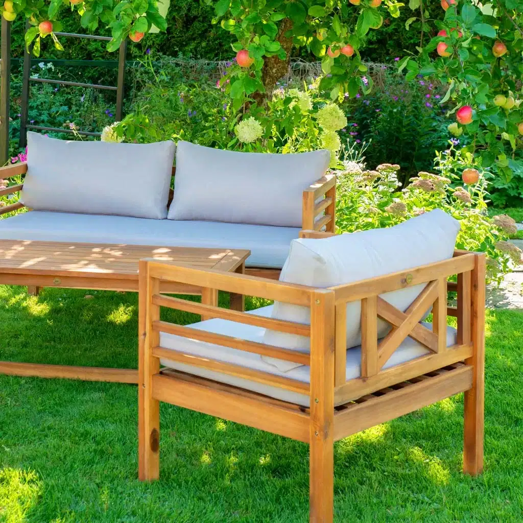 Utemöblerna i Kinsley K&C-serien är tillverkade av FSC-certifierat akaciaträ och finns i både naturligt utförande och i svart. Serien inkluderar allt från loungeset till bänkar, samt mer specialiserade produkter som serveringsvagnar. Dynor ingår, och dynornas design gör rengöringen enkel samtidigt som de erbjuder hållbar komfort.