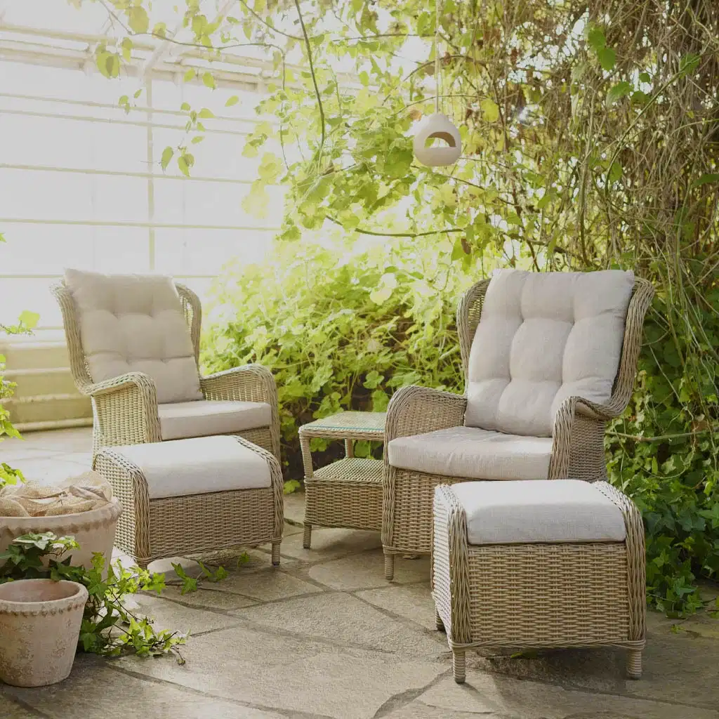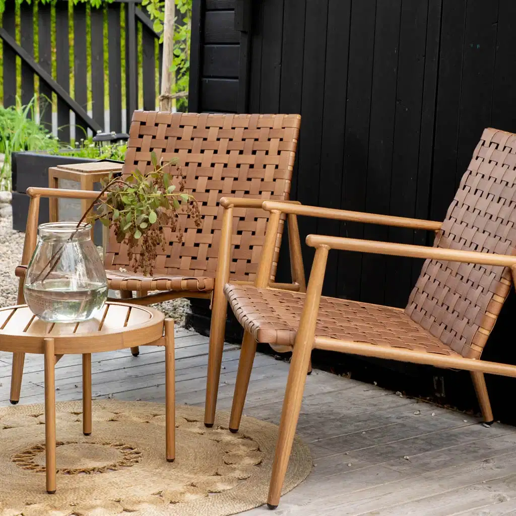 Möblerna har en lätt men stabil ram i aluminium och är klädda i elegant och slitstark konstrotting. Detta gör möblerna både väderbeständiga och lätta att underhålla.