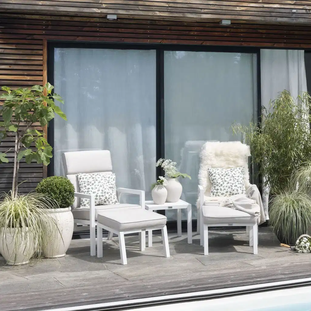 Saltnes är klassiska möbler i en romantisk stil. De har en solid, rostfri aluminiumram och UV-beständig konstrotting som garanterar lång hållbarhet och minimalt underhåll. Möblerna i serien är tjocka och bekväma, perfekt för att sjunka ner i och njuta av livet utomhus. Dynorna är i Olefintyg, känt för sin slitstyrka, motståndskraft mot blekning och vattenavvisande egenskaper. Saltnes är byggda för att tåla skandinaviskt väder samtidigt som de ger din uteplats ett sofistikerat och inbjudande uttryck.