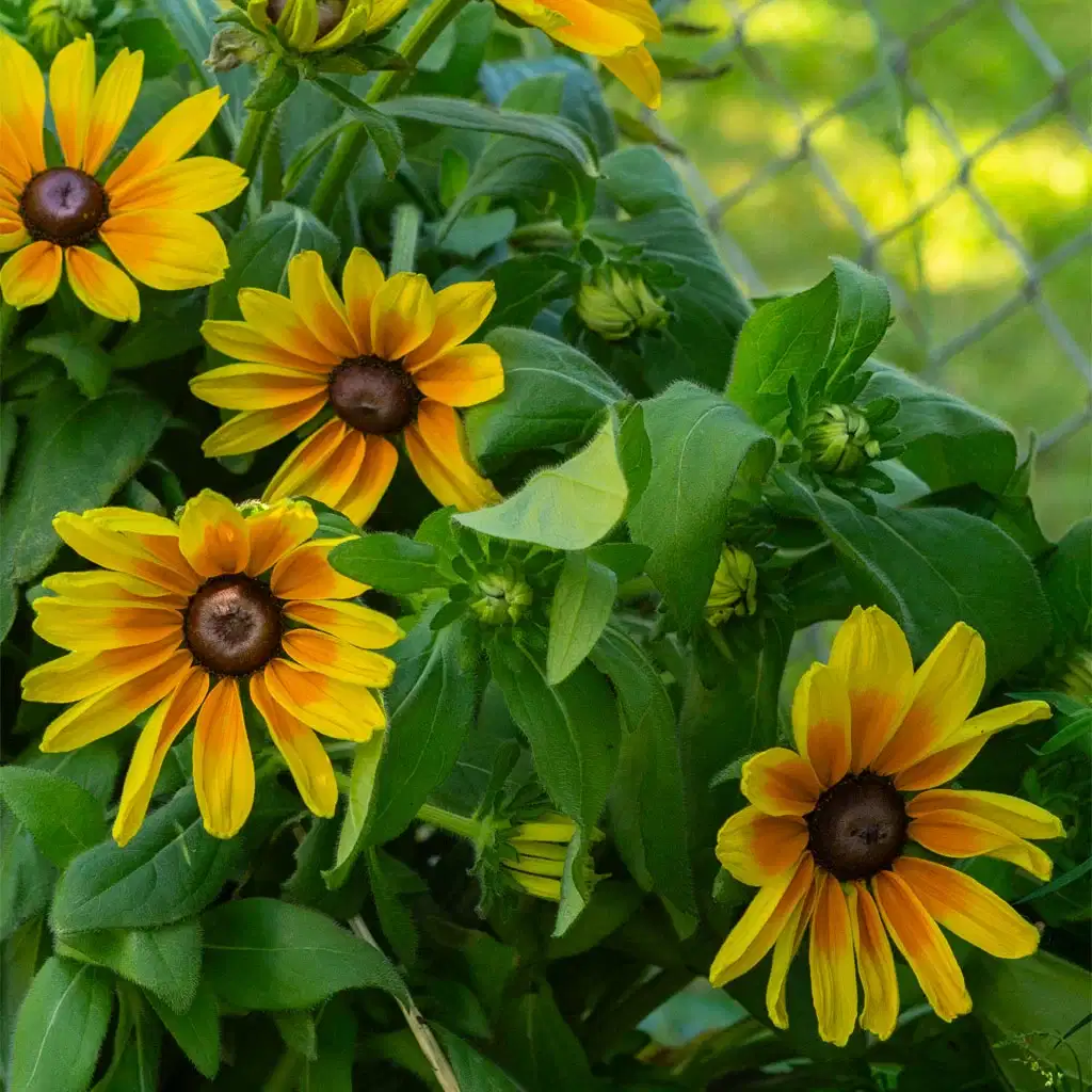 Buskar, träd och perenner som kommer tillbaka år efter år har bytt färg till mer rödaktiga toner. De höga solrosorna sträcker sig mot solen och fungerar som en kamouflagevägg framför trädgårdens studsmatta, en idé som Therese själv har kommit på och testat under flera säsonger. Hon har valt solrossorten ’Moonwalker’, eftersom den är buskig i sin växt, får flera blommor på varje stam och därmed täcker bra i bredd.
