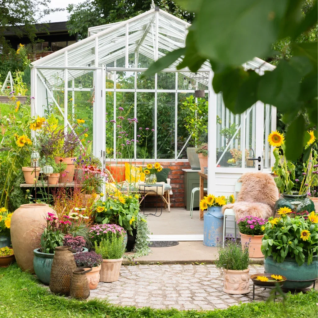 Det frodas i krukorna på den kullerstensbelagda halvcirkeln framför växthuset. Uttrycket har Anniken hämtat från små, frodiga torg hon har besökt i Frankrike. Krukor och mjölkspann i olika material och storlekar är mixade och skapar en härlig blomsterfest i rosa, gult och lila.