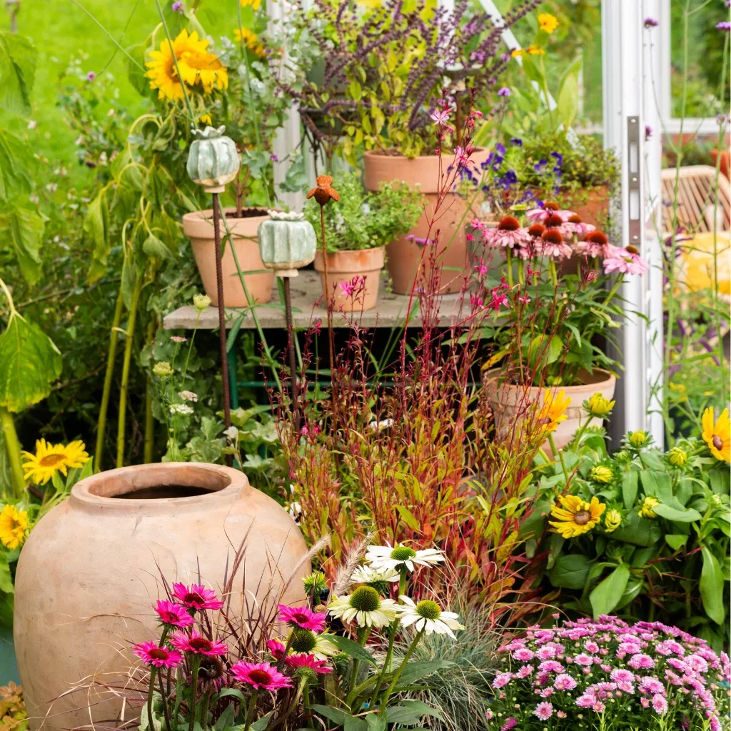 Terrakottakrukor i olika storlekar tillsammans med solmogna örter, solrosor och perenner i varma färger kännetecknar medelhavsstilen nu i slutet av trädgårdssäsongen.