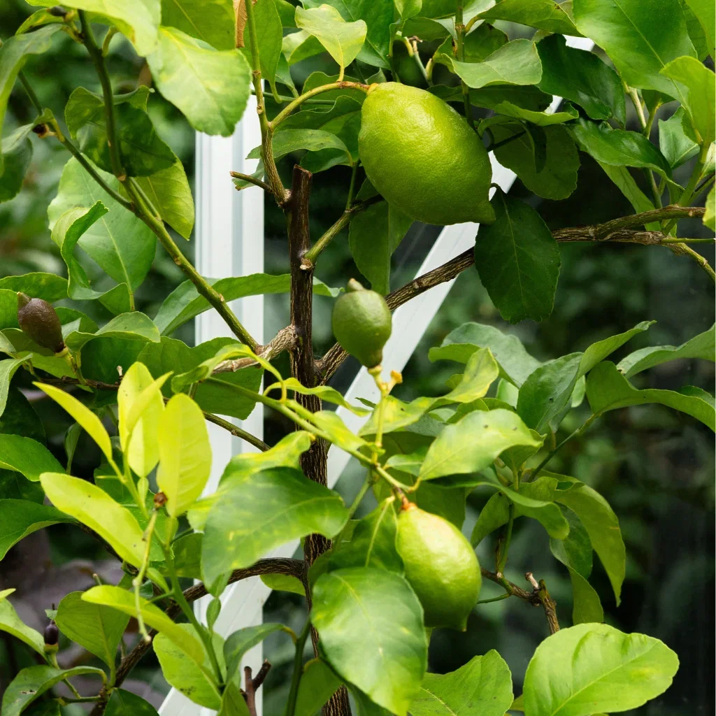 Citrusträdet trivs utmärkt ute i växthuset ända fram till frosten kommer. En ny omgång citroner är på väg. Snart blir de gula, saftiga och redo att ätas.