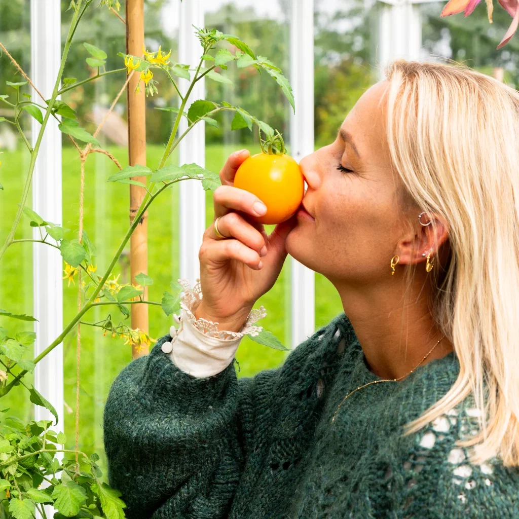 Aaah – doften av solmogna tomater! Anniken sår varje år bifftomaten ‘Brandywine Yellow’. Hennes solklara favorit.