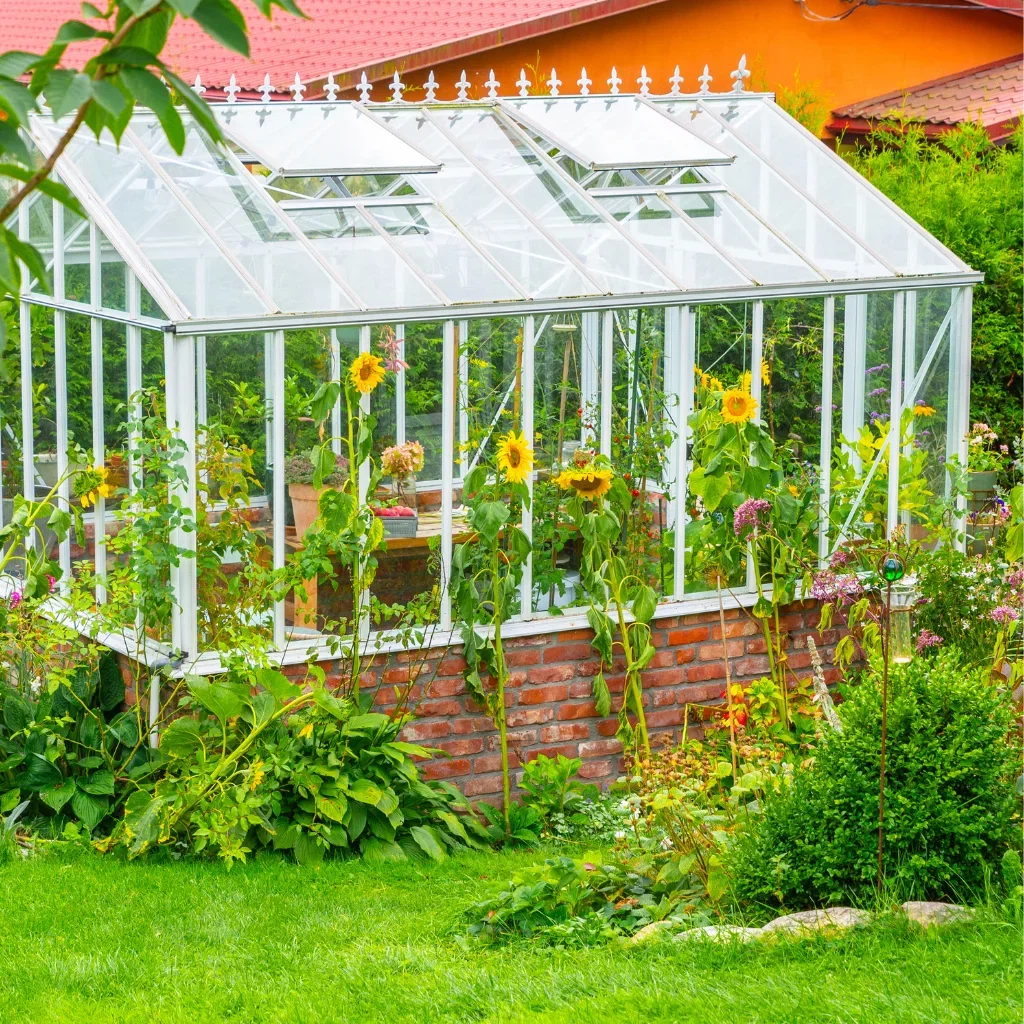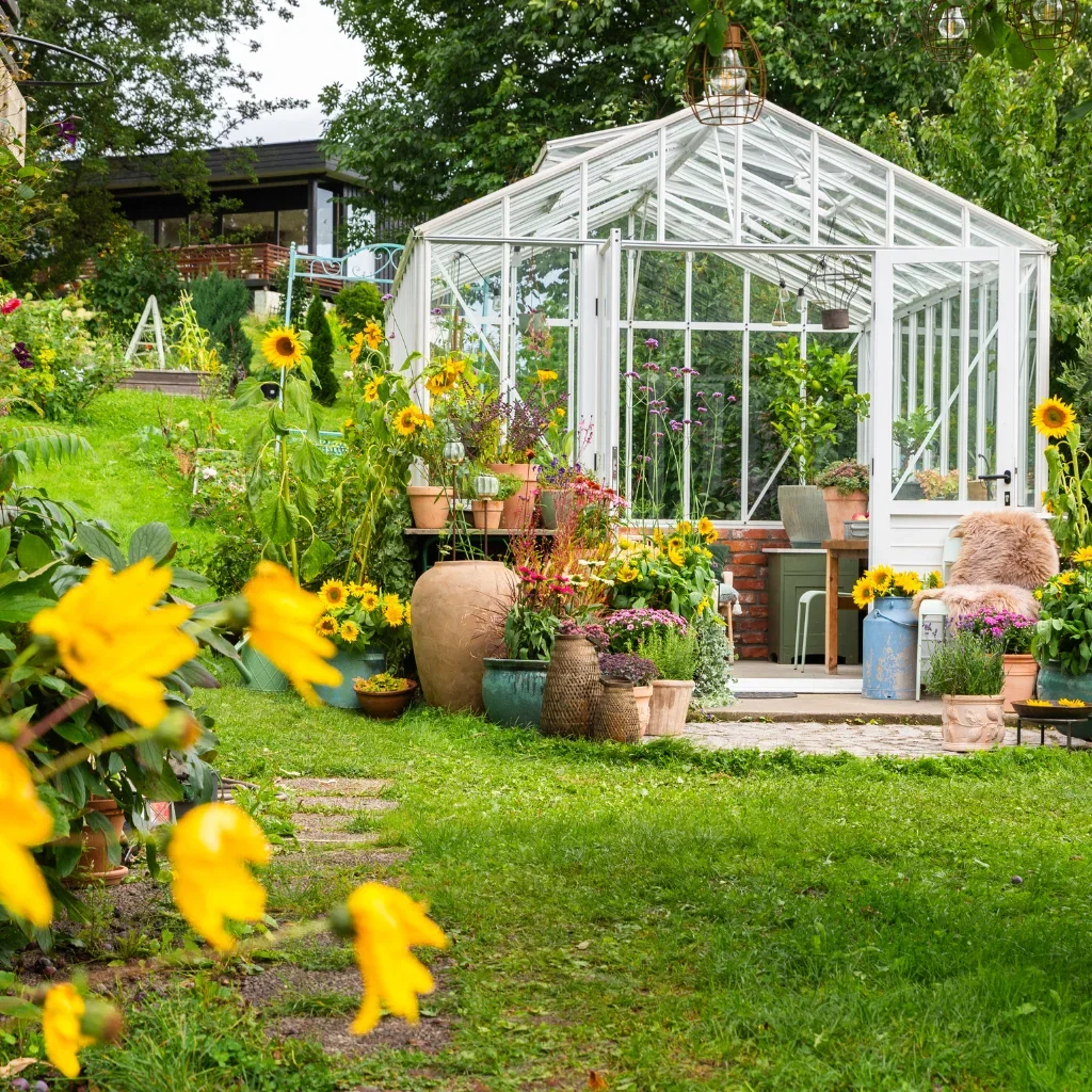 Höga solrosor omger det vackra växthuset. Tillsammans med stenmuren får de tankarna att vandra mot Sydeuropa.