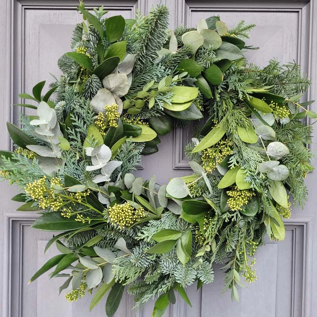 En av Thereses många vinterkransar pryder familjens ytterdörr. Det är extra roligt att hon har gjort den själv. Största delen består av blad från hennes egen trädgård.