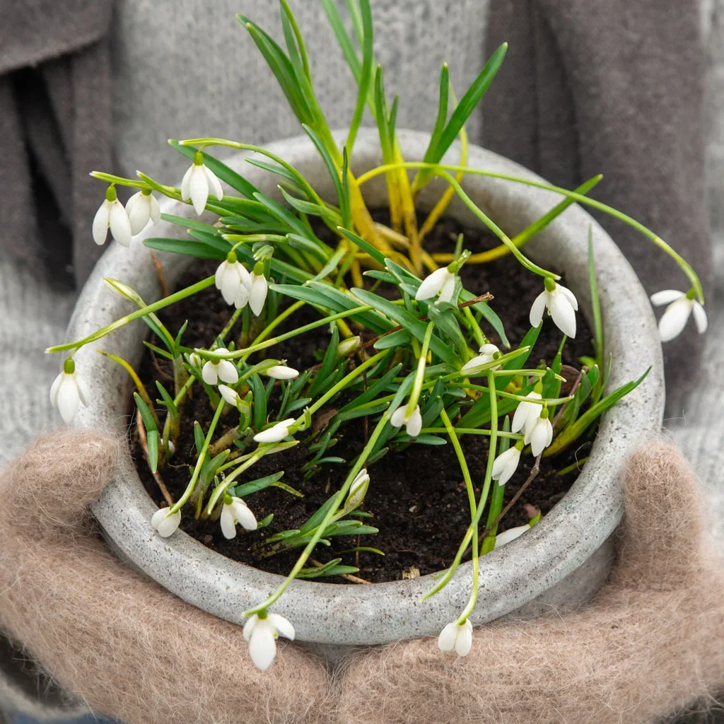 Therese har grävt upp några av de första snödropparna med rötter och jordklump och planterat dem i krukor så att de små underverken kan njutas genom vardagsrumsfönstret.