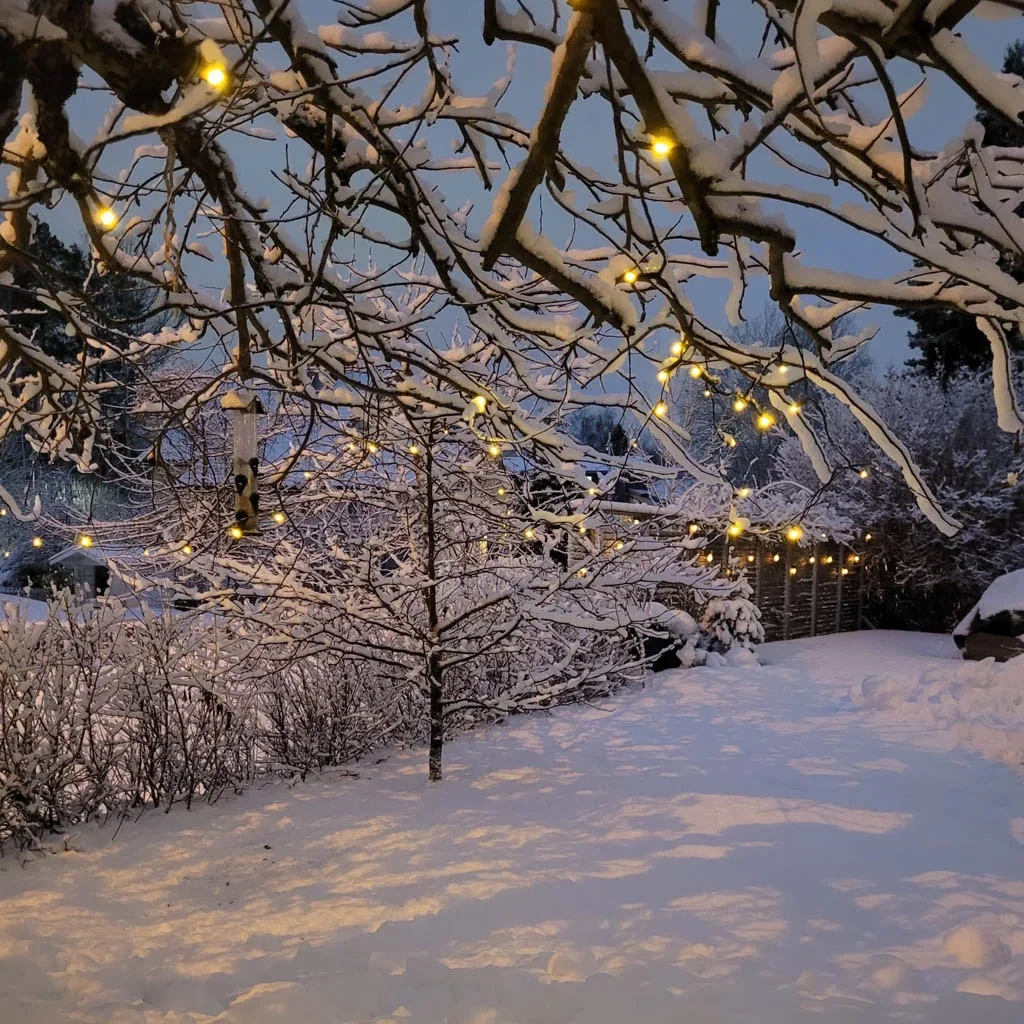Ett nytt, litet snötäcke ger trädgården ett mjukt och fräscht uttryck.