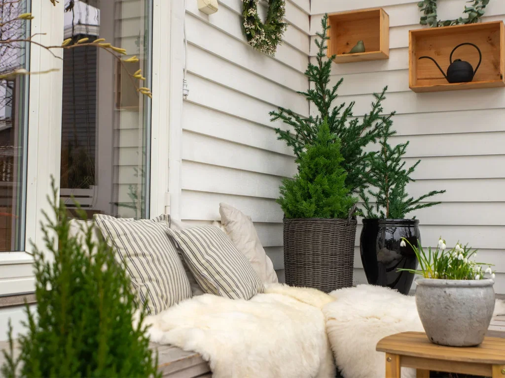 Även om trädgården ofta är täckt av vit snö på vintern, har Therese sett till att det finns ständigt gröna inslag i hela uteplatsen.