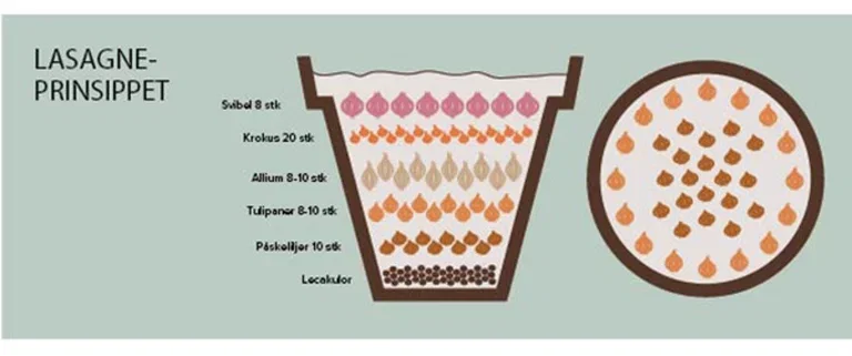 Att göra en löklasagne är när du sätter lökar i lager under hösten – för att under våren mötas av en överdådig blomning där blommorna avlöser varandra. Det är roligt och enkelt att bygga löklasagnen i en större kruka, och planteringen ger verkligen lön för mödan när våren kommer.